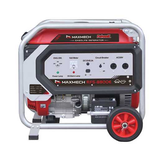 Key Specifications (Maxmech RFS-8800E)FeatureSpecification (Commonly Listed)Impact on UseStart SystemElectric Key StartProvides maximum convenience and includes a battery for push-button ignition.Max AC Output (Surge)$7.7 \text{ KVA}$ to $9.4 \text{ KVA}$High surge power, essential for starting large motors like those in AC units or industrial compressors.Rated AC Output (Continuous)$7.5 \text{ KVA}$ (or $6.2 \text{ KW}$ to $7.0 \text{ KW}$)The stable, reliable power you can run continuously to power heavy loads.Coil Material100% Copper WindingMaxmech standard, ensuring better conductivity, stable voltage, and high durability under heavy load.Engine Model190F (or similar)A powerful, single-cylinder, 4-stroke, air-cooled engine with a displacement of $420 \text{ ml}$.Fuel Tank Capacity$25 \text{ Liters}$Large capacity ensures long running times, typically 8 hours at rated output.Fuel Consumption$\approx 2.8 \text{ L/hour}$ (at lowest consumption rate)Relatively fuel-efficient for its power class.AVR SystemAutomatic Voltage RegulatorEssential for stabilizing power and protecting all connected devices, including sensitive electronics.
